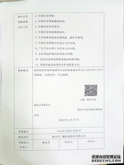 已制訂《惠州市廣鑫織線股份有限公司突發(fā)環(huán)境事件應(yīng)急預(yù)案》,并于2024年05月27日在惠州市生態(tài)環(huán)境局博羅分局備案,